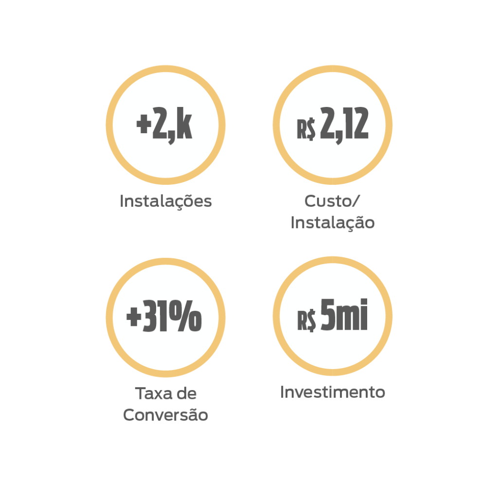 Após iniciar a solução de Tráfego Pago o número de instalações do app foi para 2.818, com um custo de R$ 2,12. Sua taxa de conversão obteve um aumento para mais de 31,45% com um investimento de R$ 5.987,87.